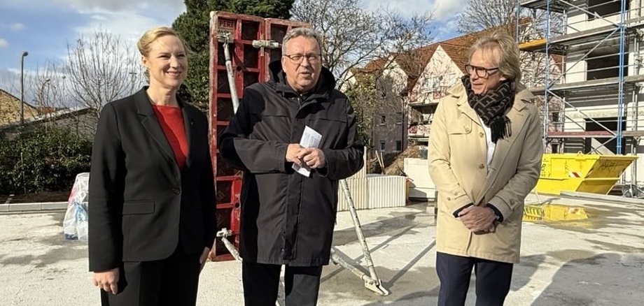 Bildunterschrift: Sozialministerin Dörte Schall (von links), Landrat und KWV-Vorstand Clemens Körner sowie Stefan Veth, Bürgermeister VG Dannstadt-Schauernheim, freuen sich über den Baufortschritt. Foto: Rhein-Pfalz-Kreis.