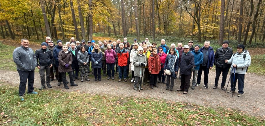 Vom Festplatz aus ging es auf der rund sieben Kilometer langen Wanderung zunächst zum Wasserwerk Dudenhofen und zum Beginn des Naturlehrpfades. Dieser wurde 1973 angelegt und beinhaltet rund 40 einheimische Bäume und Sträucher sowie ein paar Exoten, darunter etwa Mammutbäume. Vorbei am Platz des Weihnachtswaldbasars – der jedes Jahr am dritten Advent stattfindet – zog die Gruppe weiter zum sogenannten Kriegsbaum: Die rund 200 Jahre alte Kiefer ist ein Naturdenkmal und erinnert daran, dass hinter ihr elf Hektar Wald zu Beginn des 1. Weltkriegs kahlgeschlagen wurden.