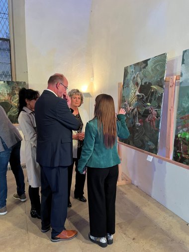 „Wenn Sie heute die Ausstellung verlassen, wünsche ich Ihnen nicht nur Inspiration, sondern auch die Neugier, auf künftige Begegnungen. Die Partnerschaft zwischen dem Rhein-Pfalz-Kreis und dem Saalekreis lebt von Menschen wie Ihnen: von Ihrem Interesse, Ihrem Engagement und Ihrer Begeisterung für Kunst und Kultur“, betonte Landrat Hartmut Handschak und bedankte sich bei den Organisatoren und den Künstlern für die gelungene Ausstellung.
