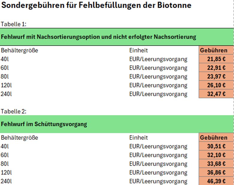 Auch hier fällt für die abgebrochene Leerung die Leerungsgebühr an. Zusätzlich wird eine Sondergebühr fällig, die sich nach der Größe der Biotonne richtet (vgl. § 18 Abs. 4 Abfallwirtschaftssatzung).