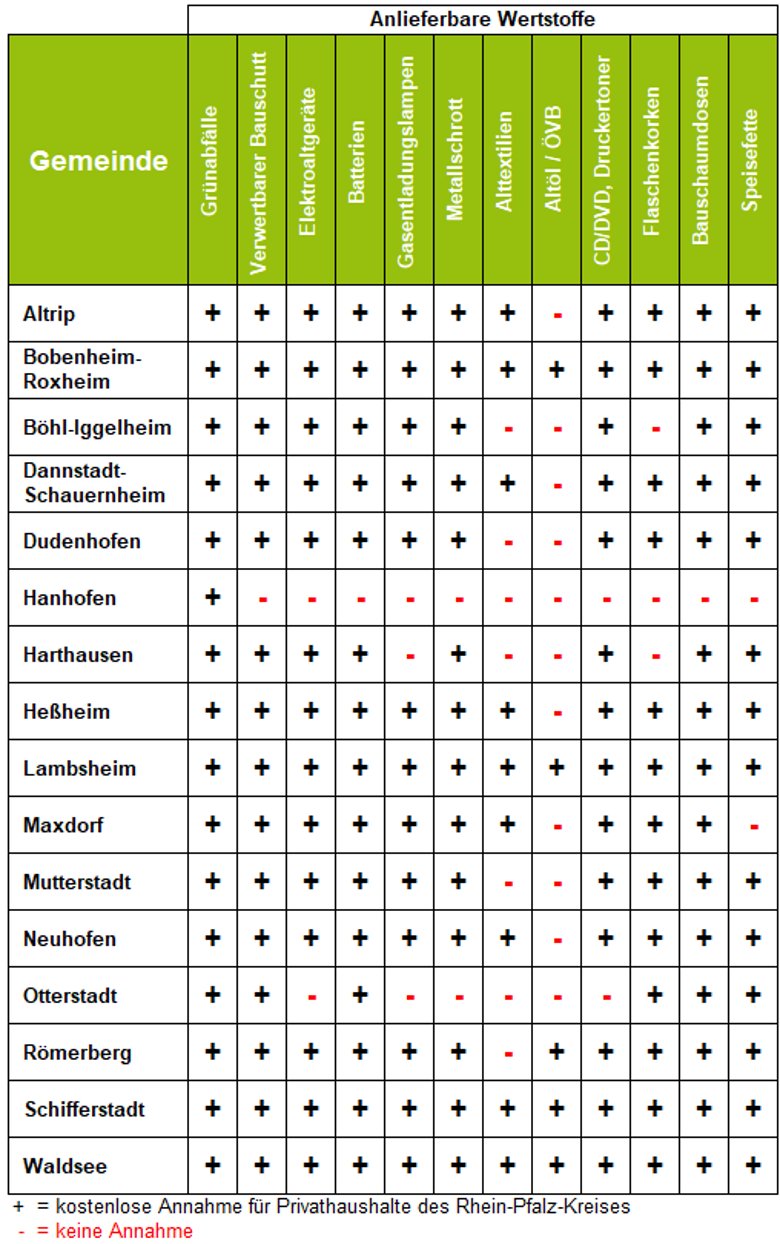Die Wertstoffhöfe im Rhein-Pfalz-Kreis haben die Funktion, den Kreiseinwohnern ein Entsorgungsangebot für bestimmte verwertbare Abfälle in haushaltsüblichen Mengen anzubieten. Diese kostenlose Anliefermöglichkeit wird über die allgemeinen Abfallgebühren finanziert. Das Entsorgungsangebot auf dem Wertstoffhof ersetzt daher nicht die Notwendigkeit, bei größeren Mengen private Entsorgungsbetriebe in Anspruch zu nehmen. Aus Gründen der Gebührengerechtigkeit und zur Vermeidung von Kapazitätsengpässen werden für einzelne Abfallarten Höchstmengen für die Anlieferungen festgelegt.